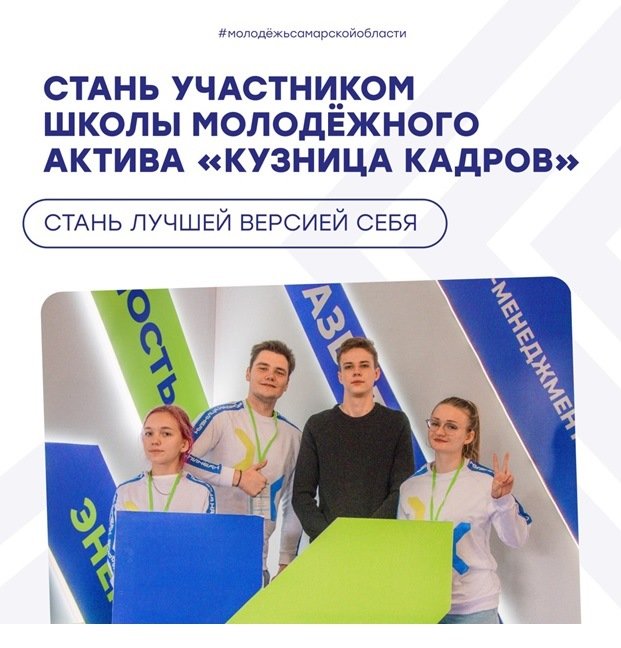 Школа молодёжного актива «Кузница кадров» является частью программы комплексного развития молодежи Самарской области «Регион для молодых» в рамках национального проекта «Образование» и проводится при поддержке Правительства Самарской области и Росмолодежи. Проект направлен на повышение профессиональных и лидерских компетенций молодых людей в сфере организации деятельности школьного, студенческого самоуправления, а также среди работающей молодежи. Впервые проект «Кузница кадров» был реализован в 2011 году, и за годы его проведения выпустил более тысячи выпускников – лидеров и активистов студенческого самоуправления.