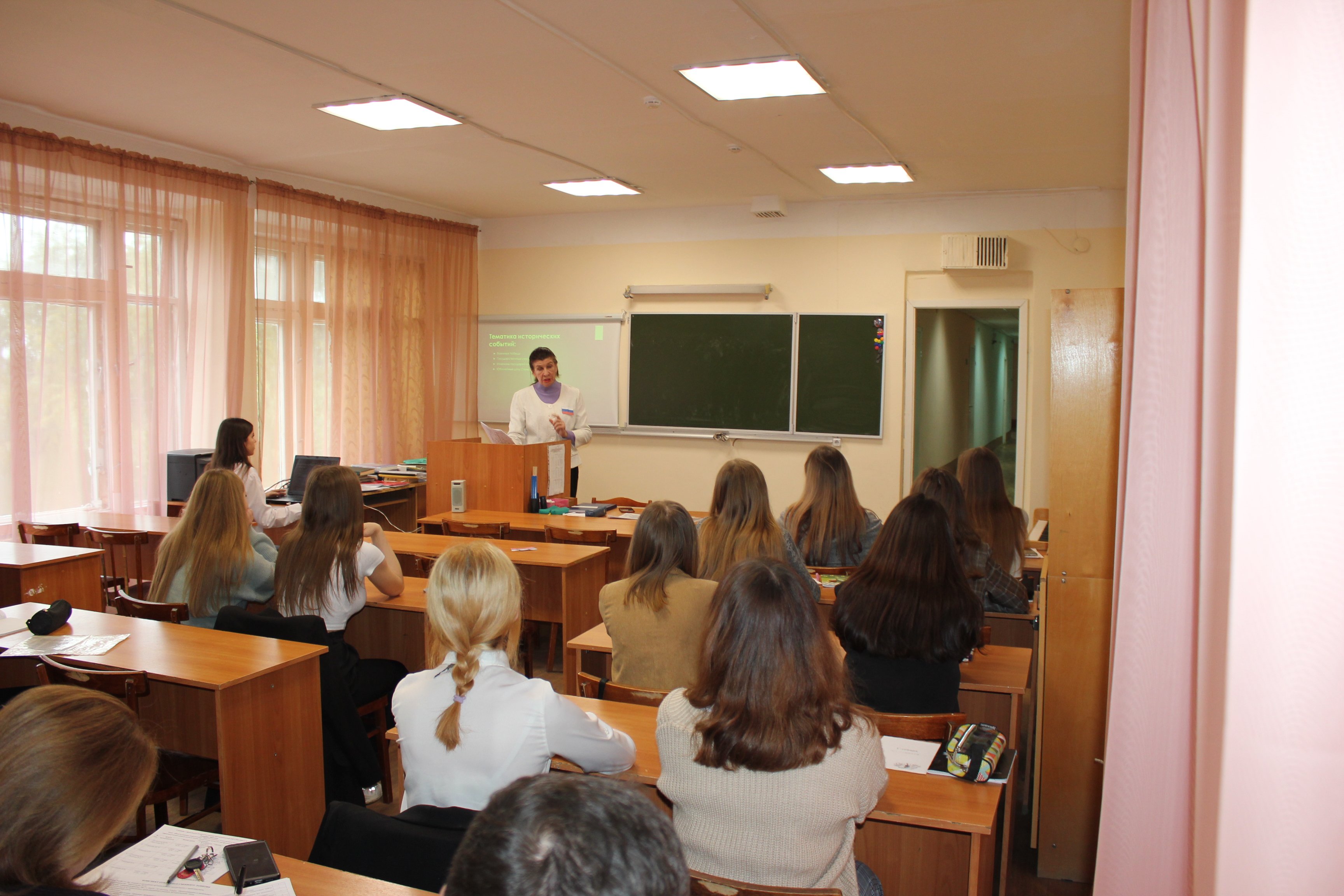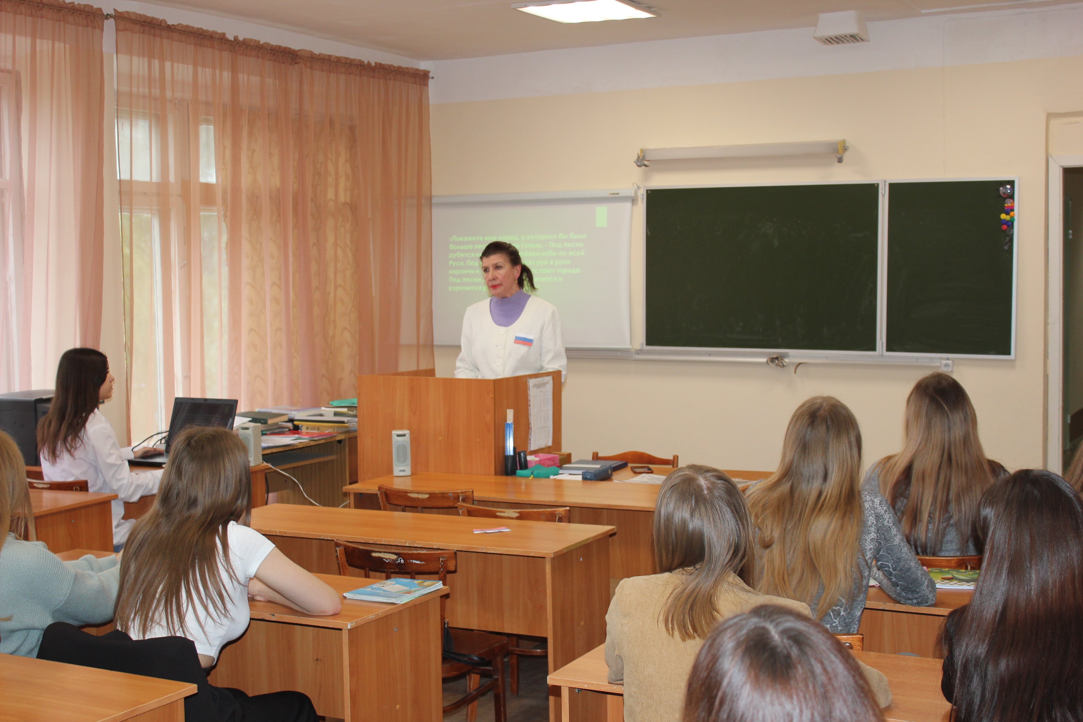 Духовно-нравственные качества были затронуты на уроках по МДК 01.08 Теория и методика музыкального воспитания с практикумом (преподаватель Николаева Н.Н.) и Литературы (преподаватель Следкова М.П.). Преподаватели умело использовали технологии проблемного обучения, критического мышления, организовывали активную дискуссию на уроках и формировали нравственные и патриотические качества у студентов. Студенты 12 группы (преподаватель Следкова М.П.) анализировали социально-философские истоки бунта Раскольникова. Студенты 32 группы (преподаватель Николаева Н.Н.) анализировали произведения патриотического характера как с точки зрения из музыкального строения, так и значимости и обстоятельств их возникновения, Петрашова Ксения очень душевно исполнила песню «Огонёк». Наталья Николаевна с первых минут урока погрузила студентов в ситуацию сопричастности патриотическим чувствам, через внешние атрибуты (прикрепив на грудь студентов флаги РФ, изготовленные из бумаги) и проведенные параллели исторических событий (в которых появлялись музыкальные произведения) событиям современности. А Марина Петровна погружала студентов в размышления героев, подталкивала их к критическому анализу их мотивации и через образы героев проводила ассоциативные параллели сегодняшним дням.